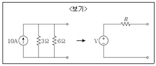 <보기>와 같이 전류원과 2개의 병렬저항으로 구성된 회로를 전압원과 1개의 직렬저항으로 변환할 때, 변환된 전압원의 전압과 직렬저항 값은?