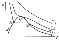 그림은 물의 압력-체적 선도(P-V)를 나타낸다. A′ACBB′ 곡선은 상들 사이의 경계를 나타내며, T1, T2, T3는 물의 P-V 관계를 나타내는 등온곡선들이다. 이 그림에서 점 C는 무엇을 의미하는가?