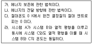 다음은 열역학 기본법칙을 설명한 것이다. 0법칙, 1법칙, 2법칙, 3법칙 순으로 옳게 나열한 것은?