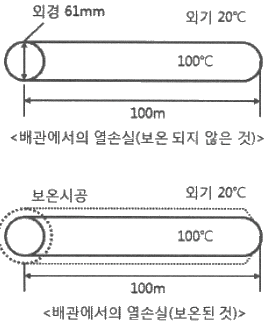 그림의 배관에서 보온하기 전 표면 열전달율(a)이 12.3kcal/m2ㆍhㆍ℃ 이었다. 여기에 글라스울 보온통으로 시공하여 방산열량이 28kcal/mㆍh가 되었다면 보온효율은 얼마인가? (단, 외기온도는 20℃이다.)
