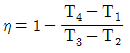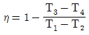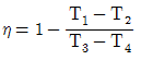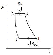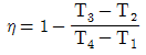 그림과 같은 브레이턴 사이클에서 효율(η)은? (단, P는 압력, v는 비체적이며, T1, T2, T3, T4는 각각의 지점에서의 온도이다, 또한, qin과 qout은 사이클에서 열이 들어오고 나감을 의미한다.)