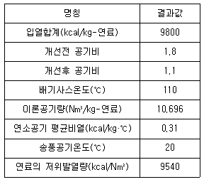 증기 10t/h를 이용하는 보일러의 에너지 진단 결과가 아래 표와 같다. 이 때, 공기비 개선을 통한 에너지 절감률(%)은?