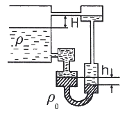 다음 그림과 같이 수은을 넣은 차압계를 이용하는 액면계에 있어 수은면의 높이차(h)가 50.0mm일 때 상부의 압력 취출구에서 탱크 내 액면까지의 높이(H)는 약 몇 mm 인가? (단, 액의 밀도(ρ)는 999 kg/m3이고, 수은의 밀도(ρ0)는 13550 kg/m3 이다.)