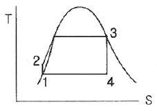 그림은 랭킨사이클의 온도, 엔트로피(T-S)선도이다. 상태 1~4의 비엔탈피 값이 h1=192kJ/kg, h2=194kJ/kg, h3=2802kJ/kg, h4=2010kJ/kg이라면 열효율(%)은?