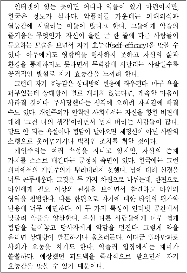 한국에서 악플이 양산되는 것은 한국인들이 타인에 대해 신경을 많이 쓰는 것과 관계가 있다.