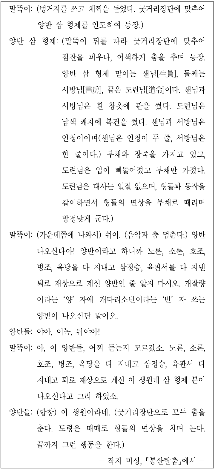 말뚝이가 굿거리장단에 맞춰 양반을 풍자하는 사설을 늘어놓았군.