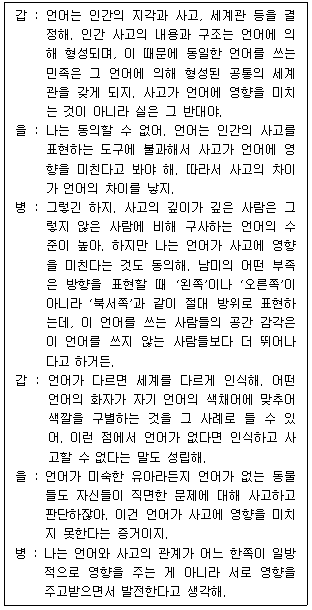 언어와 사고가 서로 영향을 주고받는 관계라는 점에 대해 갑과 을은 동의하지 않지만 병은 동의한다.
