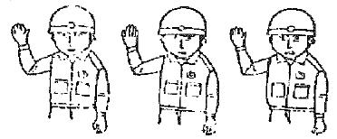 지브 크레인(Jib Crane)의 신호에서 그림과 같은 자세로 천천히 오른 손바닥을 흔들거나 좌우로 가볍게 돌리는 동작은 무엇을 나타내는 신호인가?
