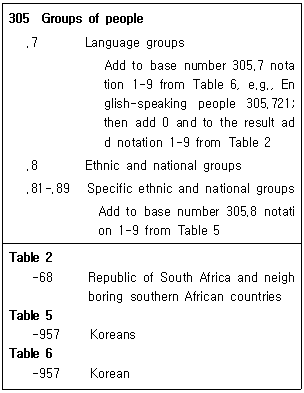DDC 제23판의 일부를 발췌한 것이다. 이를 적용한 「남아프리카에 거주하는 한국어 사용자들에 대한 사회적 연구」의 분류기호는?