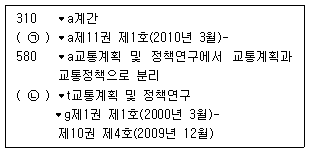 KCR 제4판과 KORMARC 형식(통합서지용, 2014 개정판)을 적용하여 연속간행물을 기술한 레코드의 일부이다. ㉠, ㉡에 들어갈 표시기호로 옳은 것은? (단, 지시기호와 띄어쓰기는 적용하지 않음) (순서대로 ㉠, ㉡)