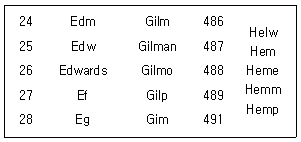 Cutter-Sanborn 세 자리 저자기호표의 일부를 발췌한 것이다. 이를 적용한 「The Stories of Unbelievable Experiences」(by Edwards Hemington)의 도서기호는?