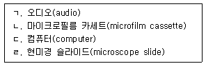 RDA에서는 자료의 물리적 측면을 매체유형과 수록매체유형으로 구분하고 있다. 매체유형으로 옳은 것으로만 묶은 것은?