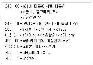 KCR 제4판과 KORMARC 형식(통합서지용, 2014 개정판)을 적용하여 서지레코드를 작성한 사례이다. ㉠, ㉡에 들어갈 표시기호는? (단, 지시기호와 띄어쓰기는 적용하지 않음) (순서대로 ㉠, ㉡)