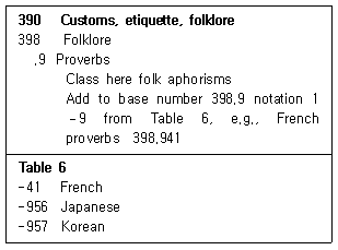 DDC 제23판의 일부를 발췌한 것이다. 이를 적용한 「한국어 속담(Korean proverbs)」의 분류기호는?