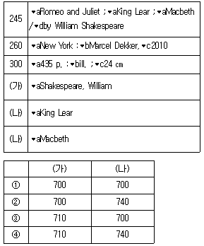 KORMARC 형식(통합서지용, 2014 개정판)을 적용하여 서지레코드를 기술할 때 (가)와 (나)를 바르게 연결한 것은? (지시기호와 띄어쓰기는 고려하지 않음)
