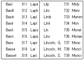 Cutter-Sanborn 세 자리 저자기호표의 일부를 발췌한 것이다. 이를 적용한 「A Biography of Abraham Lincoln / by Roy Basler」의 도서기호는?