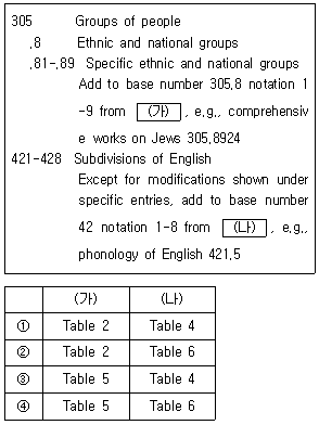 DDC 제23판의 본표 일부를 발췌한 것이다. (가)와 (나)에 들어갈 보조표를 바르게 연결한 것은?