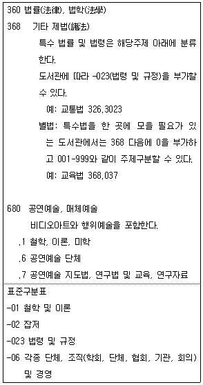 KDC 제6판의 본표와 표준구분표의 일부를 발췌한 것이다. 이를 적용한 「공연법」의 분류기호로 모두 옳은 것은?