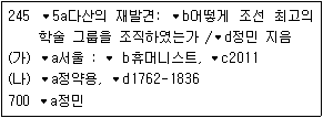 한국목록규칙 제4판을 적용하여 KORMARC(통합서지용, 2014 개정판) 형식으로 작성한 레코드의 일부이다. (가), (나)에 들어갈 표시기호는? (단, 지시기호와 띄어쓰기는 적용하지 않는다)