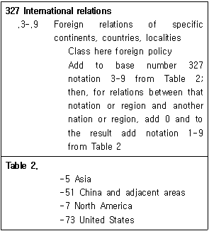 DDC 제23판의 일부를 발췌한 것이다. 이를 적용한 「미중외교(미국과 중국의 국제관계)」의 분류기호는?