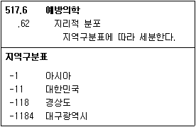 KDC 제6판의 일부를 발췌한 것이다. 이를 적용한 「대구지역 전염병 대응」의 분류기호는?