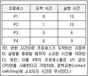 다음 표에서 보인 4개의 프로세스들을 시간 할당량(time quantum)이 5인 라운드로빈(round-robin) 스케줄링 기법으로 실행시켰을 때 평균 반환 시간으로 옳은 것은?
