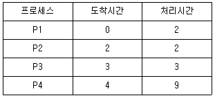 프로세스 P1, P2, P3, P4를 선입선출(First In First Out) 방식 으로 스케줄링을 수행할 경우 평균응답시간으로 옳은 것은? (단, 응답시간은 프로세스 도착시간부터 처리가 종료될 때까지의 시간을 말한다)