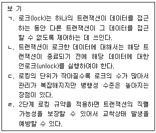 데이터베이스 상의 병행제어를 위한 로킹(locking) 기법에 대한 <보기>의 설명 중 옳은 것의 총 개수는?