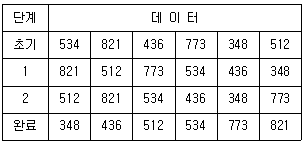 다음은 정렬 알고리즘을 이용해 초기 단계의 데이터를 완료 단계의 데이터로 정렬하는 과정을 보여 준다. 이 과정에 사용된 정렬 알고리즘으로 적절한 것은?