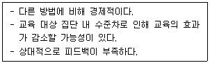 교육 및 훈련방법 중 다음의 특징을 갖는 방법은?