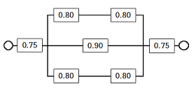 다음 그림과 같이 7개의 기기로 구성된 시스템의 신뢰도는 약 얼마인가?(단, 네모안의 숫자는 각 부품의 신뢰도이다.)