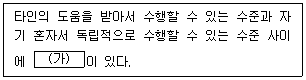 비고츠키(Vygotsky)의 사회문화이론에 근거할 때, (가)에 들어갈 말은?