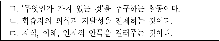 피터스(R. Peters)는 교육의 개념을 3가지 준거로 구분하였다. 그 중 규범적 준거(normative criterion)에 근거한 교육의 개념으로 옳은 것만을 모두 고른 것은?