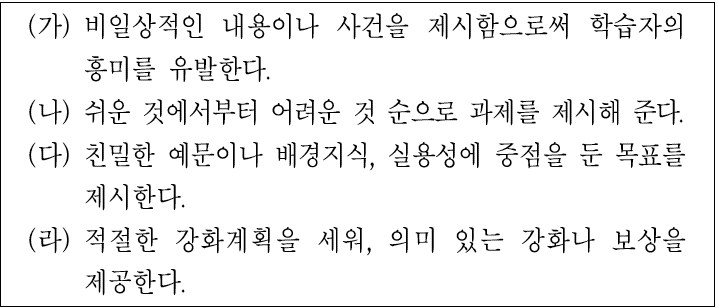 다음은 켈러(J. Keller)의 ARCS 이론에 기초하여 동기 유발ㆍ유지를 위해 수립한 교수학습 전략들이다. (가)~(라)에 해당하는 ARCS 요소를 바르게 짝지은 것은? (순서대로 가, 나, 다, 라)