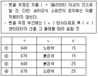 1 「소방기본법」상 벌칙 중 벌금의 상한이 나머지 셋과 다른 것은? 2 「소방기본법 시행규칙」상 소방용수시설 및 지리조사에 관한 내용으로 옳지 않은 것은? 3 「소방기본법 시행규칙」상 국고보조의 대상이 되는 소방활동장비의 종류와 규격으로 옳지 않은 것은? 4 「소방기본법 시행령」상 소방자동차 전용구역의 설치 방법에 관한 내용이다. ( ) 안에 들어갈 내용으로 옳은 것은? 5 「소방기본법 시행규칙」상 지하에 설치하는 소화전 또는 저수조의 경우 소방용수표지는 다음 기준에 따라 설치하여야 한다. ( ) 안에 들어갈 내용으로 옳은 것은? 6 「소방기본법 시행령」상 소방자동차 전용구역 방해행위의 기준에 관한 내용으로 옳지 않은 것은? 7 「소방의 화재조사에 관한 법률」 및 같은 법 시행규칙상 화재조사전담부서에서 갖추어야 할 장비와 시설 중 감식기기(16종)에 해당하지 않는 것은? 8 「소방의 화재조사에 관한 법률」상 화재의 정의에 관한 설명으로 옳지 않은 것은? 9 「소방의 화재조사에 관한 법률」상 벌칙에 관한 내용이다. ( ) 안에 들어갈 내용으로 옳은 것은? 10 「소방의 화재조사에 관한 법률」에 관한 내용으로 옳지 않은 것은? 11 「소방시설공사업법」상 소방기술 경력 등의 인정 등에 관한 내용으로 옳은 것은? 12 「소방시설공사업법 시행규칙」상 감리업자가 소방공사의 감리를 마쳤을 때 소방공사감리 결과보고(통보)서에 첨부하는 서류가 아닌 것은?