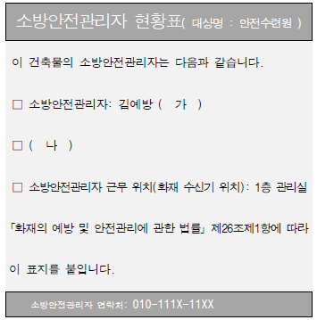 다음은 「화재의 예방 및 안전관리에 관한 법률」 및 같은 법 시행규칙상 소방안전관리대상물에 부착된 소방안전관리자 현황표이다. '가, 나'에 들어갈 내용으로 옳은 것은? (단, 아래 현황표 및 문항 내 필수 게시사항 이외의 기재내용은 예시임을 가정한다.)