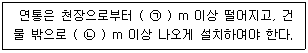 「소방기본법 시행령」상 보일러 등의 위치·구조 및 관리와 화재예방을 위하여 불의 사용에 있어서 지켜야 하는 사항 중 '난로'에 대한 설명이다. ( ) 안의 내용으로 옳게 연결된 것은?(순서대로 ㉠, ㉡)