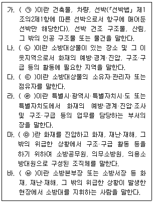 「소방기본법」상 규정하는 용어의 정의를 옳게 연결한 것은?(순서대로 ㉠, ㉡, ㉢, ㉣, ㉤, ㉥)