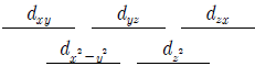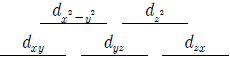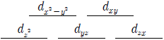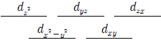 어떤 전이금속 이온의 5개 d 전자궤도함수는 동일한 에너지 준위를 이루고 있다. 이 전이금속 이온이 4개의 동일한 음이온 배위를 받아 정사면체 착화합물을 형성할 때 나타나는 에너지 준위 도표로 옳은 것은?