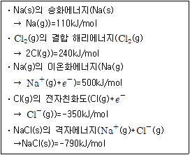 다음은 금속나트륨이 염소기체와 반응하여 고체상태의 염화나트륨을 생성하는 반응이다. [ Na(s)+1/2⋅Cl2(g)→NaCl(s) ] 이 반응의 전체 에너지 변화(△E)는?