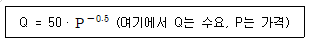 다음과 같은 수요함수에서 가격이 20% 인상될 경우 탄력성을 이용하여 수요가 얼마나 변화하는지 계산하면?
