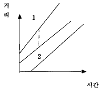 다음 그림은 인접한 차량들의 괘적을 그린 시공도(Time-distance Diagram)이다. 1과 2를 잇는 점선은 무엇을 가리키는가?