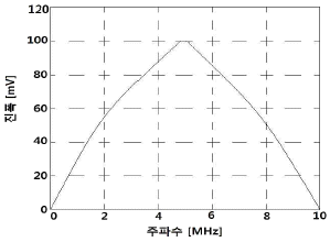 주파수에 대한 응답곡선이 그림과 같을 때 탐촉자의 밴드폭(band width)은 약 얼마인가?