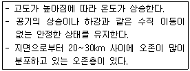 지구의 대기권은 고도에 따른 기온의 분표에 의해 몇 개의 권역으로 구분하는데, 다음 설명에 해당 하는 것은?