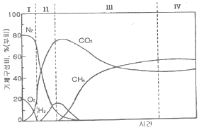 다음 그림은 폐기물을 매립한 후 발생하는 생성가스의 농도 변화를 단계적으로 나타낸 것이다. 유기물이 효소에 의해 발효되는 “혐기성 비메탄” 단계는?