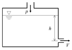 그림과 같은 물탱크에서 수심(h)이 4m인 위치에 작은 오리피스가 설치되어 있다. 수면 위 공기층의 계기압력(p)을 30kPa로 유지시킬 때, 오리피스에서의 토출유속(m/s)은 약 얼마인가? (단, 오리피스의 유속계수는 0.7, 물의 밀도는 1,000kg/m3, 중력가속도는 9.8m/s2이다.)