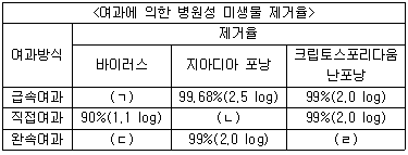 불활성화비 계산방법 및 정수처리 인증 등에 관한 규정상 급속여과방식에서 소독에 의한 병원성 미생물 제거율 및 불활성화비에 관한 내용이다. ()에 들어갈 내용으 로 옳지 않은 것은?