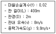 B정수장에서 직선관로의 조건이 다음게 같을 때 Darcy-Weisbach 공식을 적용한 관 손실수두(m)는 약 얼마인가?