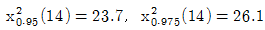 어떤 회사에서 제조하는 제품 15개를 추출하여 중량에 대한 표본 분산을 계산한 결과 10g이 나왔다. 위험률 α=5%로 제품중량에 대한 분산이 8g을 넘을 것인지 검정을 하였을 때의 결과로 맞는 것은? (단, 제품 중량은 정규분포를 따른다고 가정하며,