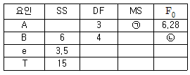 A는 4수준, B는 5수준 반복이 없는 2원 배치 실험의 분산분석 결과가 [표]와 같을 때, ㉠과 ㉡에 들어갈 값은 약 얼마인가? (단, 인자 A, B는 모두 모수인자이다.)